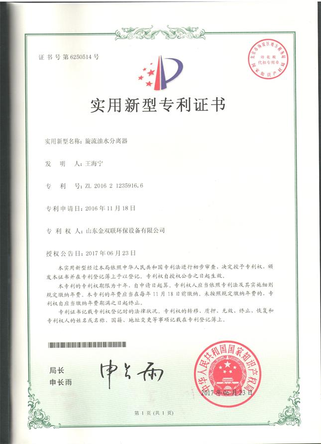 旋流油水分離器專利證書